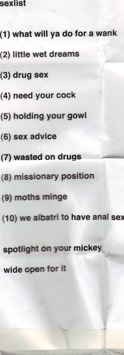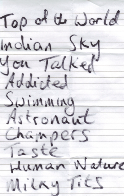 Next we have the Alphastates set list. This is handwritten on a sheet of A4 paper and seems perfectly normal until we get to the last song Milky Tits (which was actually an excellent rendition of Angel Kiss, dedicated to lead singer Catherine Dowling's unborn child):