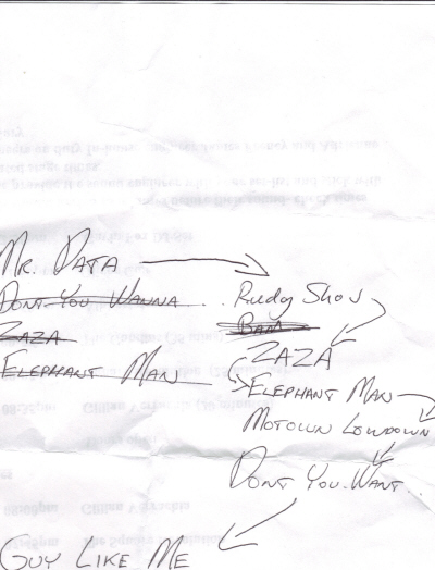 Next we have the Alphastates set list. This is handwritten on a sheet of A4 paper and seems perfectly normal until we get to the last song Milky Tits (which was actually an excellent rendition of Angel Kiss, dedicated to lead singer Catherine Dowling's unborn child):